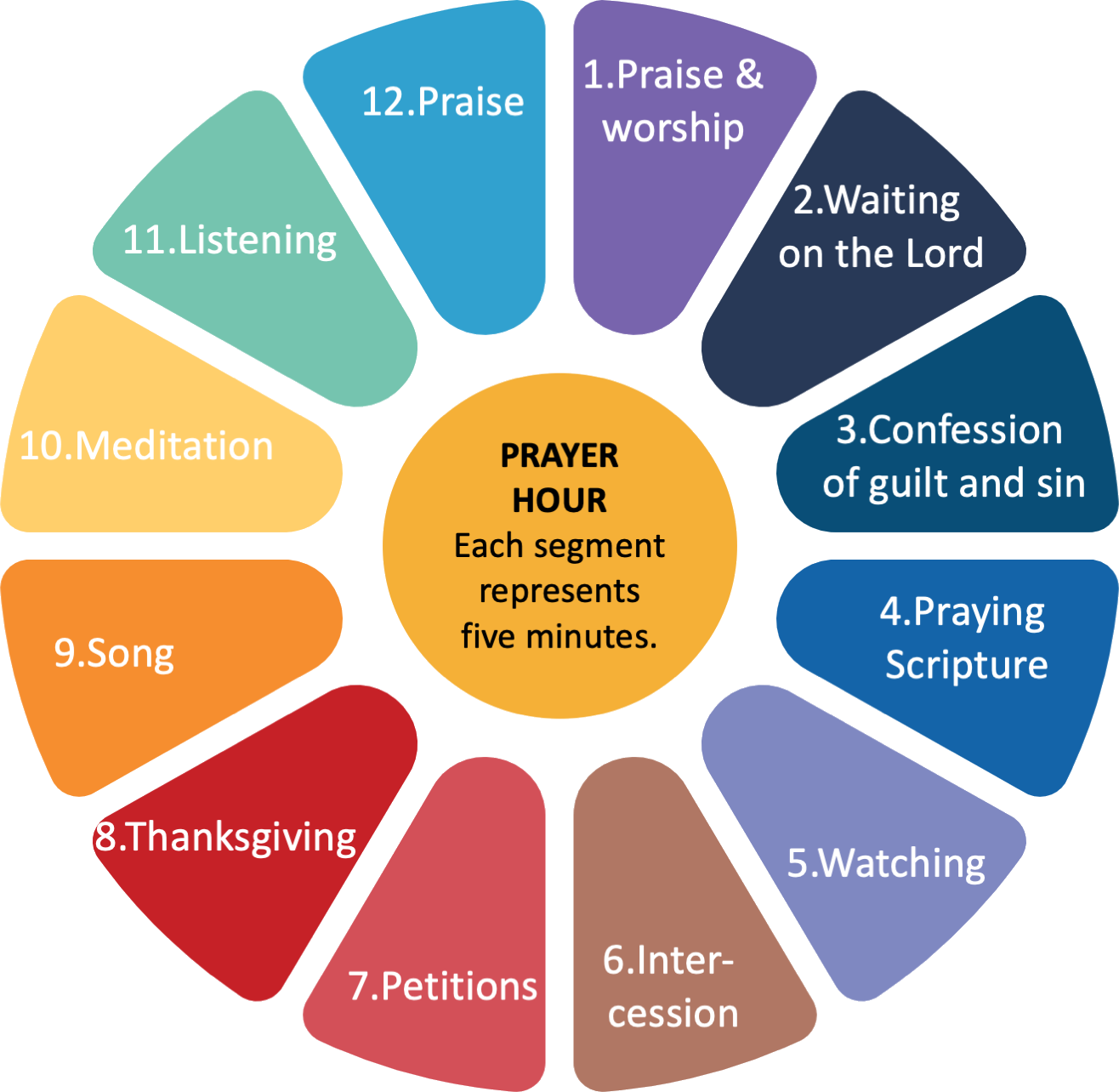 This sketch (diagram) will help you to know in which areas you have to focus on in your prayer. This sketch will especially help you in the prayer periods of waiting, intercession, listening, and thanksgiving.